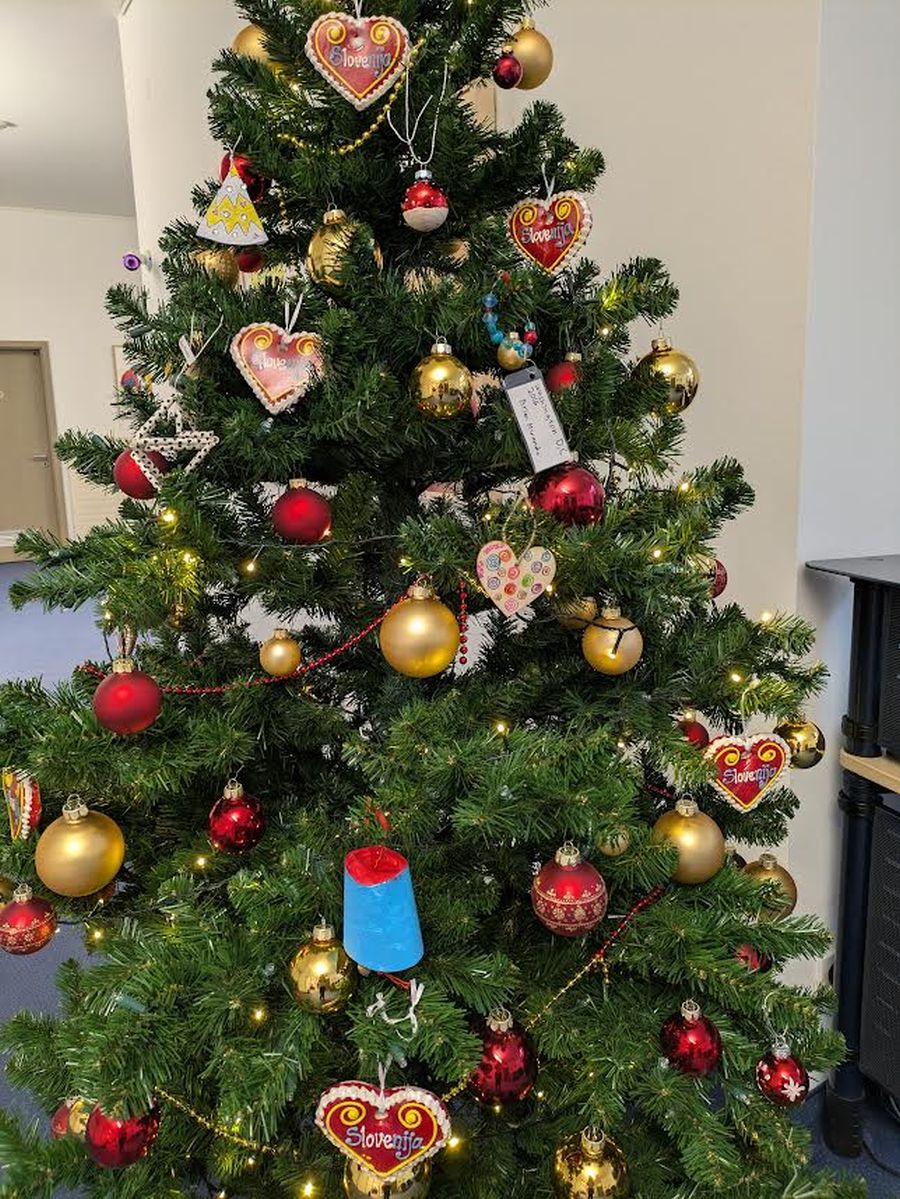 Tudi na Uradu vlade za komuniciranje je postavljeno drevo, okrašeno z majhnimi okraski, ki nosijo močno sporočilo ljubezni in spoštovanja do domovine in narave. Foto: UKOM