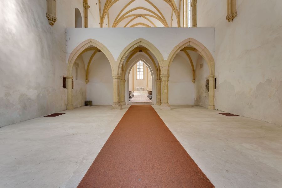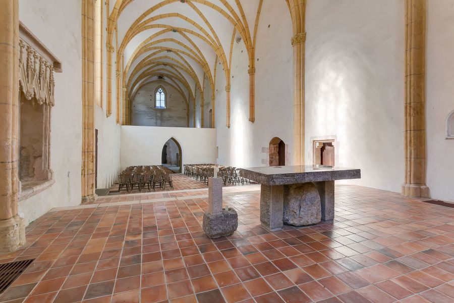 Leta 1413 sta bila posvečena dva oltarja, kar kaže, da je cerkev že stala, glavni oltar pa je leta 1420 posvetil Hermanov nezakonski sin, Herman, freisinški škof. Iz virov je razvidno, da se je gradnja nekaterih samostanskih poslopij nadaljevala še v letih 1427 in 1433. Foto: Katarina Kovačič/ Občina Šentjernej