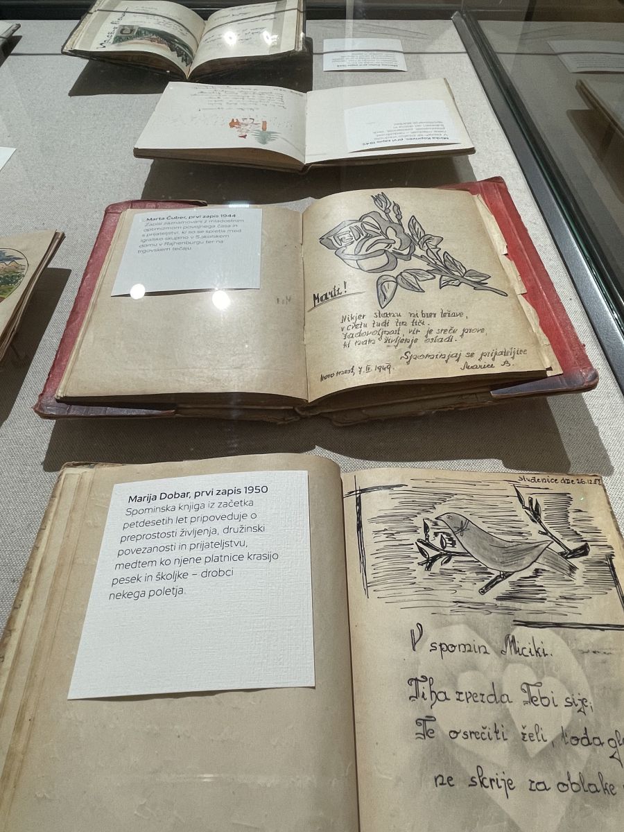 Slovenski etnografski muzej je v začetku decembra 2025 odprl razstavo Spominske knjige. Pred tem je objavil javni poziv, na katerega je odgovorilo 57 posameznikov, ki so posodili 132 spominskih knjig. Številni primerki so razkošno ilustrirani, nekateri vsebujejo tudi umetniška dela priznanih slovenskih ustvarjalcev. Albumi, oblikovani za kroženje med družino, sorodniki, sošolci in učitelji, hranijo verze, nasvete in risbe, ki pogosto povedo več kot besede. Vsak prikazan album pripoveduje zgodbo o odnosih, skupnostih in času, ki ga je zaznamoval.