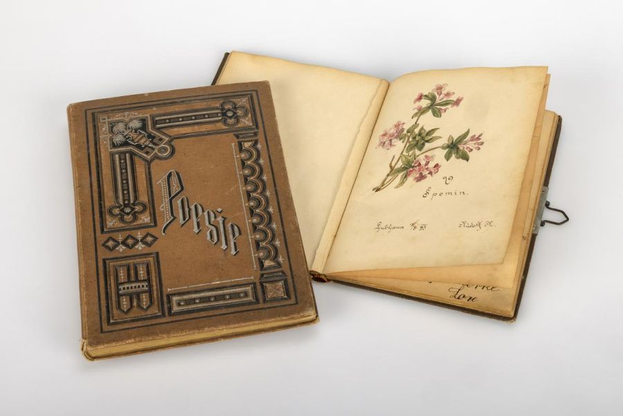 V 19. stoletju so se po habsburških deželah široko razširili spominski albumi z naslovom Poesie ali Poesie-Album, ki so del nemške sentimentalne tradicije. Zaradi nemško govorečega šolskega sistema so bili pogosti tudi v Sloveniji. Poesie ni naslov kakšne znane knjige, temveč splošna oznaka za takšne albume. Foto: Jan Simončič